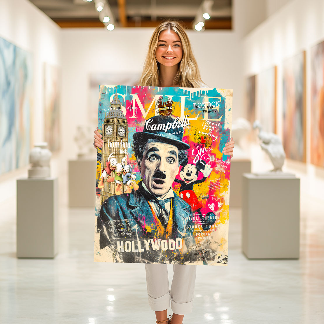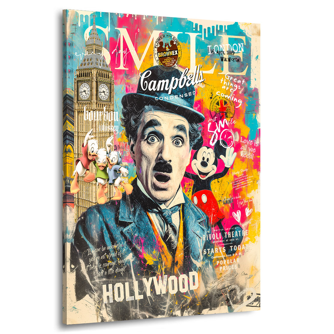 Dieses farbenfrohe Wandbild vereint Charlie Chaplin, Mickey Mouse und Pop-Art-Elemente zu einem echten Kunst-Statement. Mit ikonischen Symbolen aus London, Hollywood und der Comicwelt ist es eine Hommage an Filmgeschichte, Nostalgie und kreativen Ausdruck.