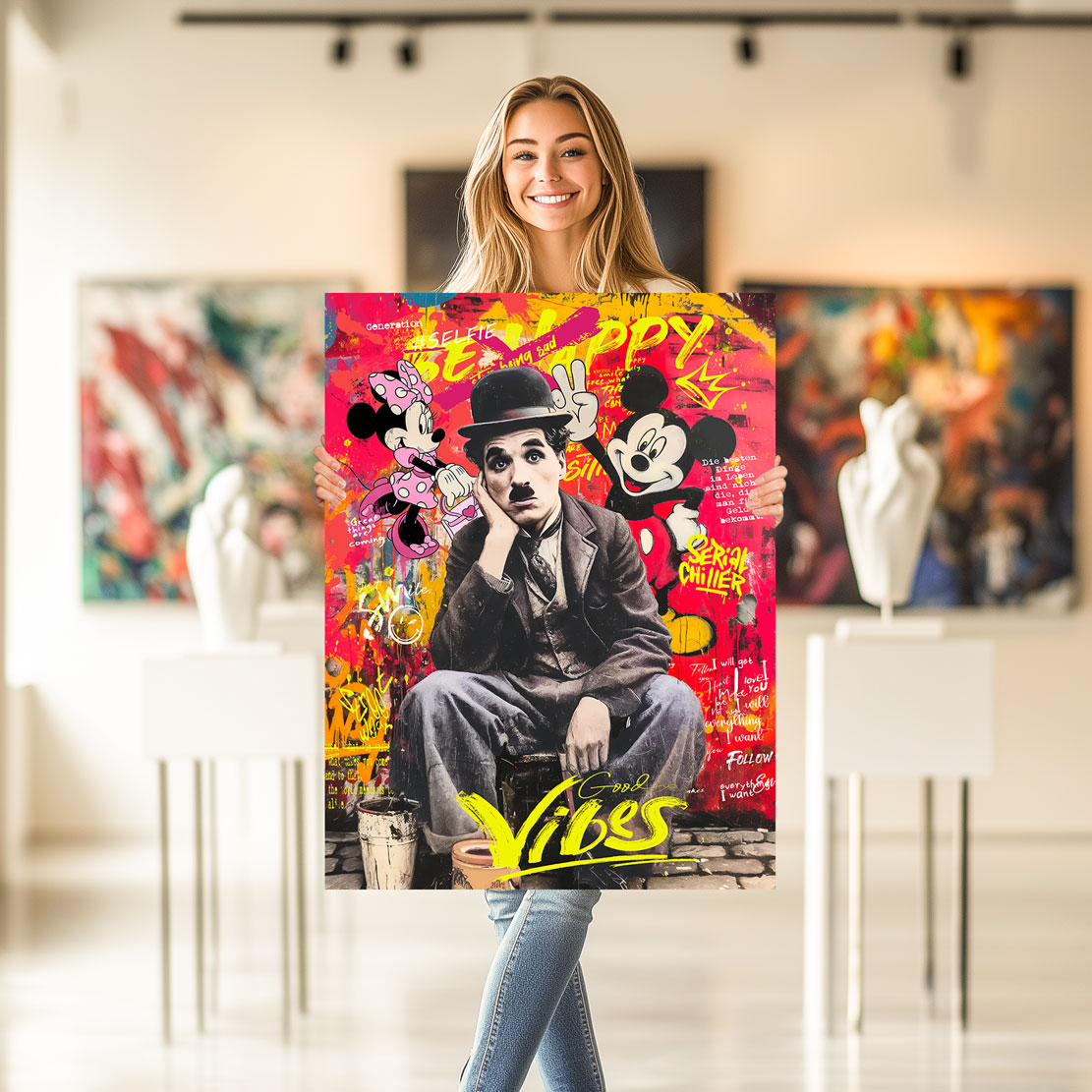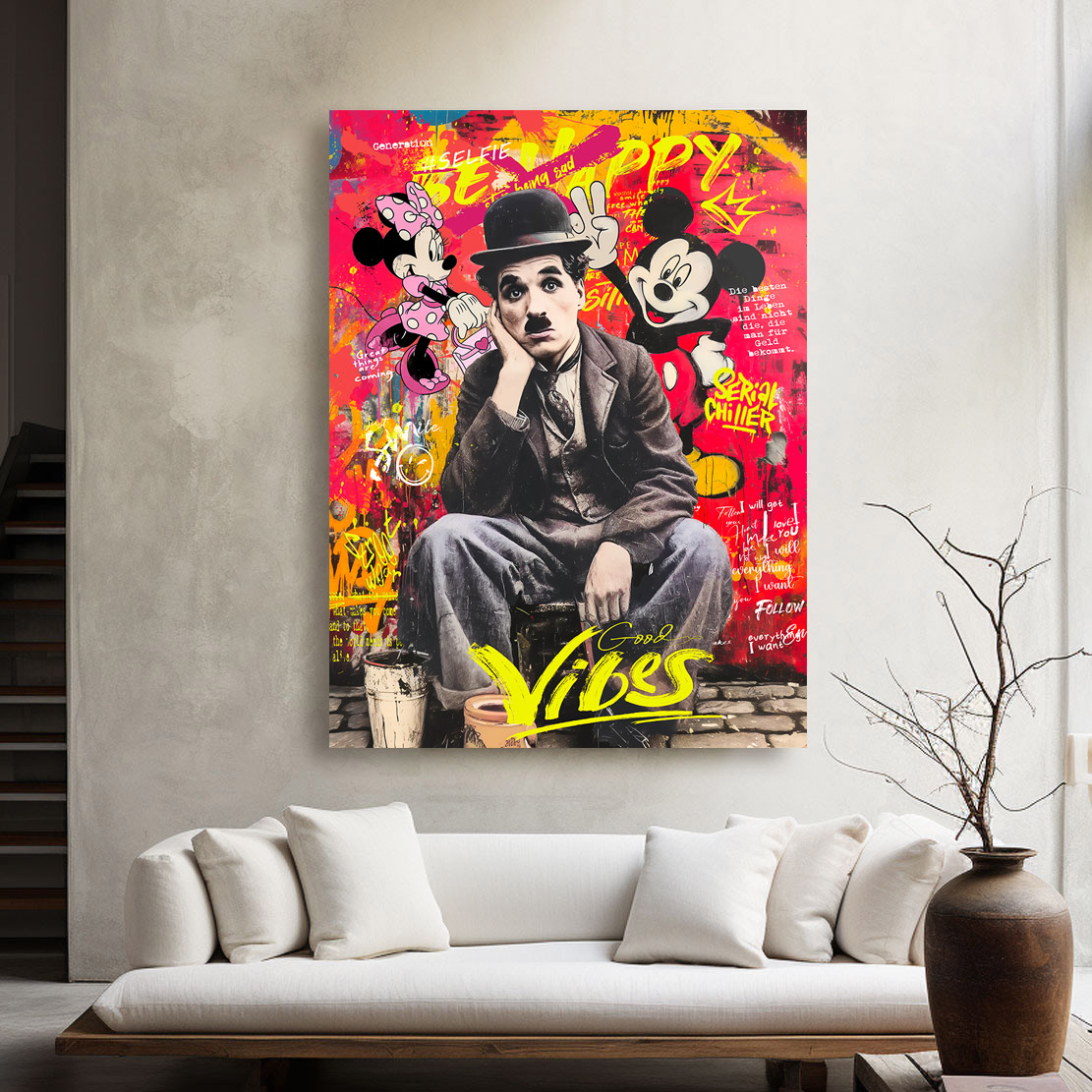 Dieses farbenfrohe Pop Art Wandbild zeigt Charlie Chaplin mit Mickey und Minnie Mouse vor einem urbanen Graffiti-Hintergrund. Die Botschaft „Good Vibes“ sorgt für eine positive Ausstrahlung in jedem Raum – kreativ, retro & modern zugleich.