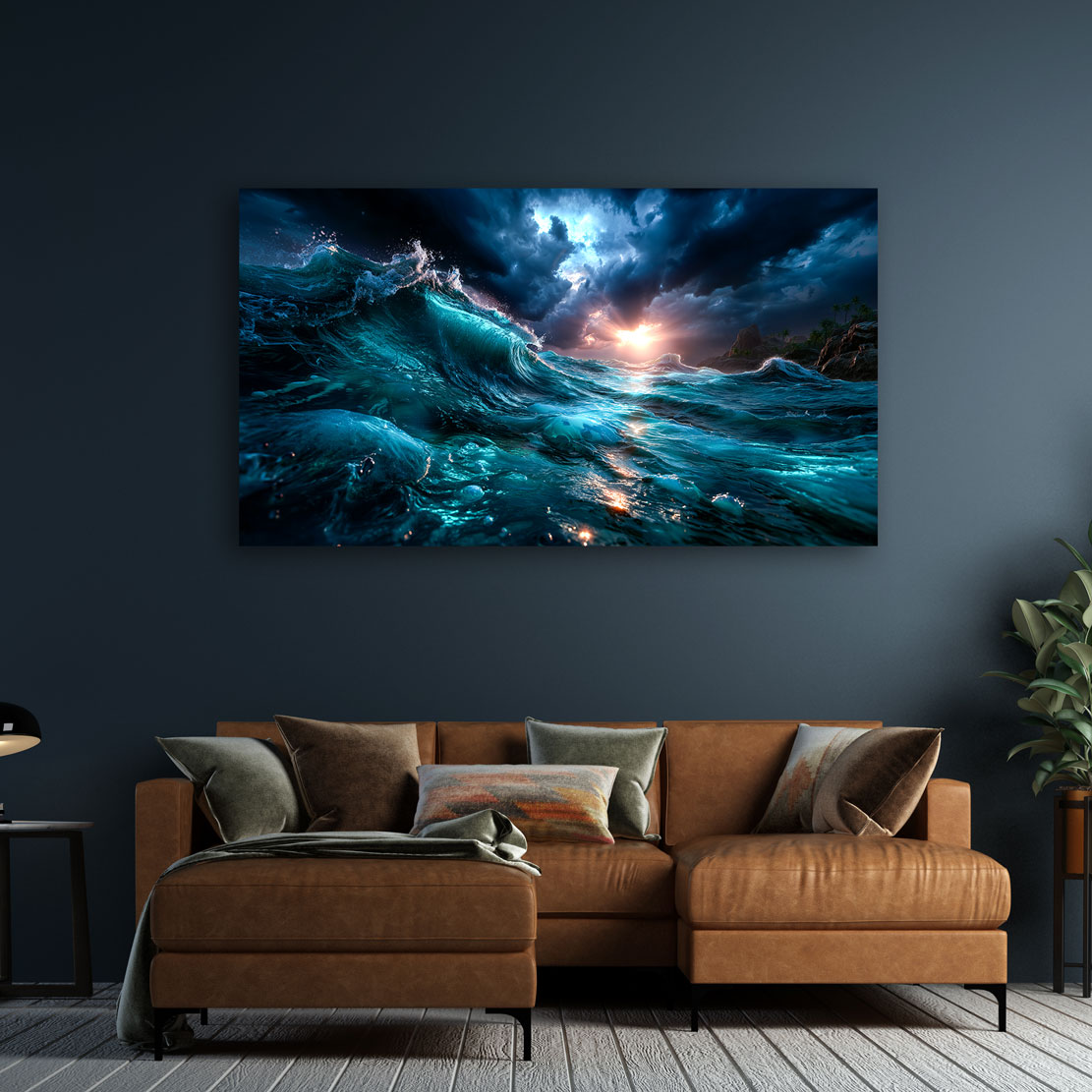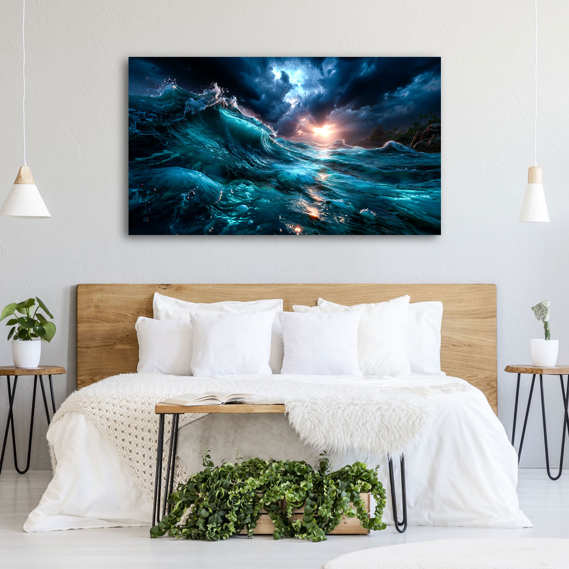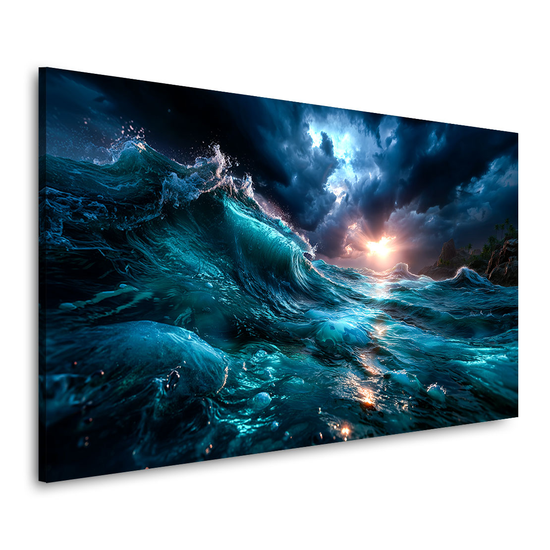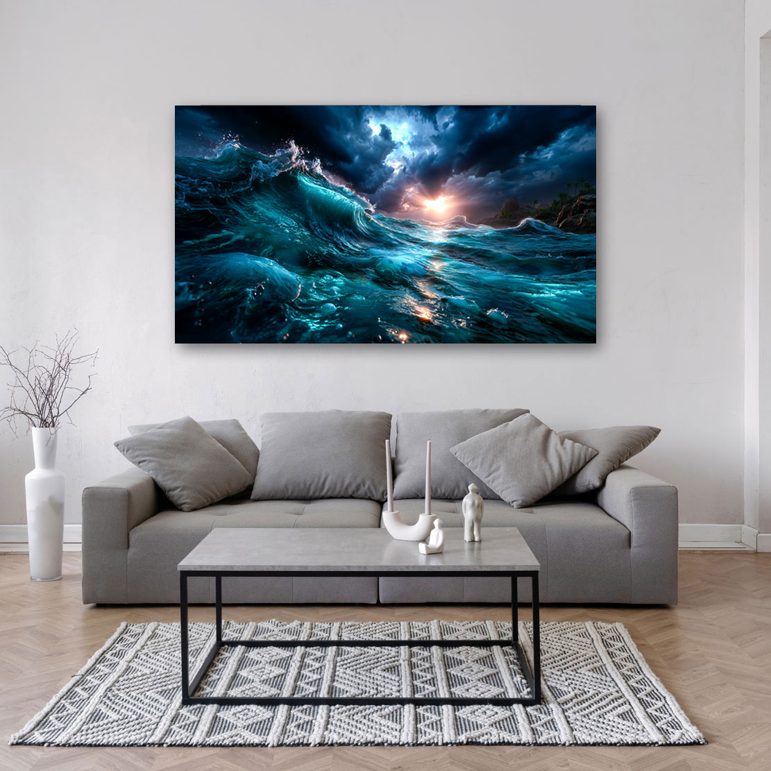 Ocean Majesty Blue Horizon bringt die Kraft des Meeres in kunstvoller Form an deine Wand. Perfekt für Wohnzimmer, Empfangsbereiche, Wellnessräume oder moderne Büros mit Hang zu Dynamik und Eleganz.