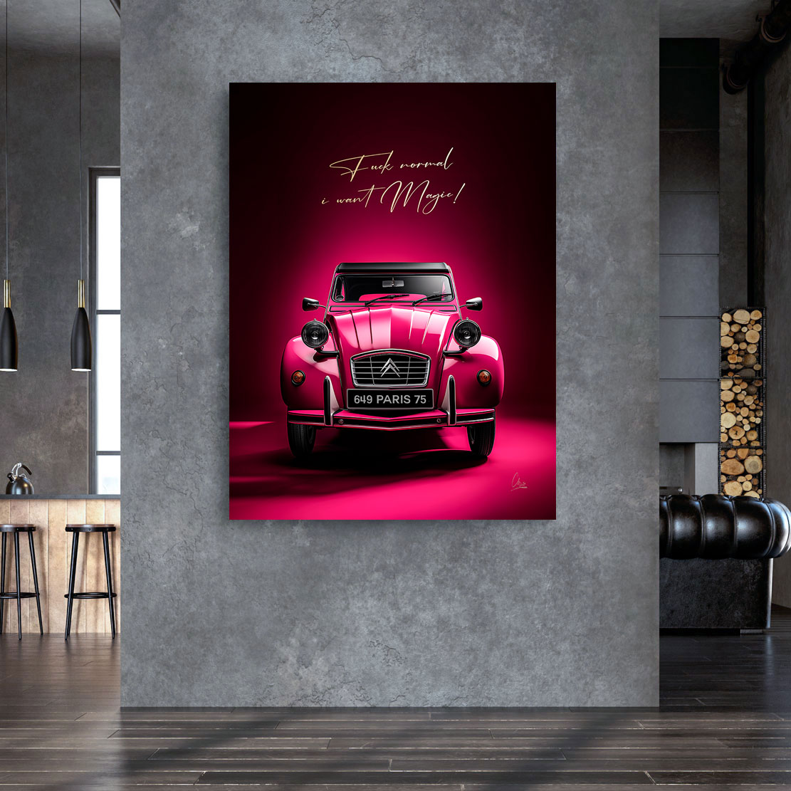 Auffälliges Lifestyle-Motiv mit einem leuchtend pinken Citroën vor edlem Hintergrund und dem Schriftzug „I want Magic“ – perfekt für Wohnzimmer, Bars, kreative Studios oder trendige Shops. Ein Bild, das Stil und Individualität ausstrahlt.