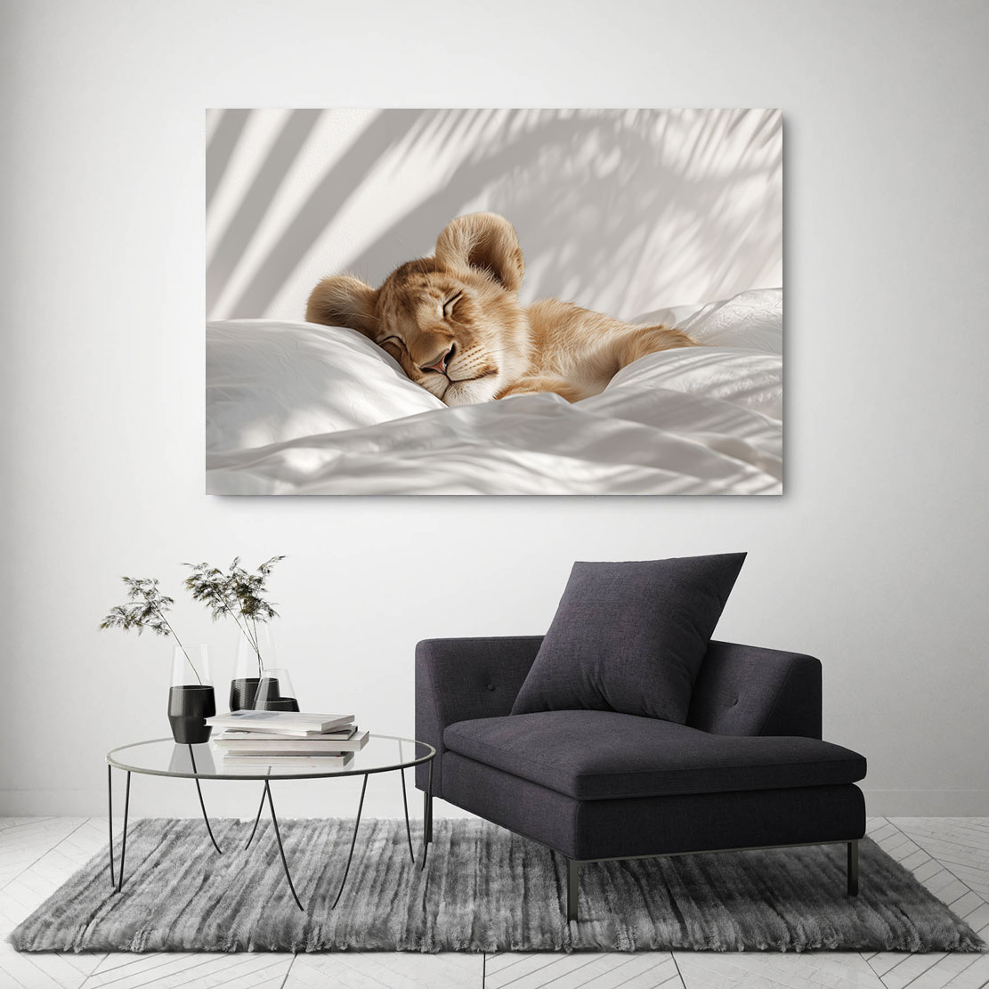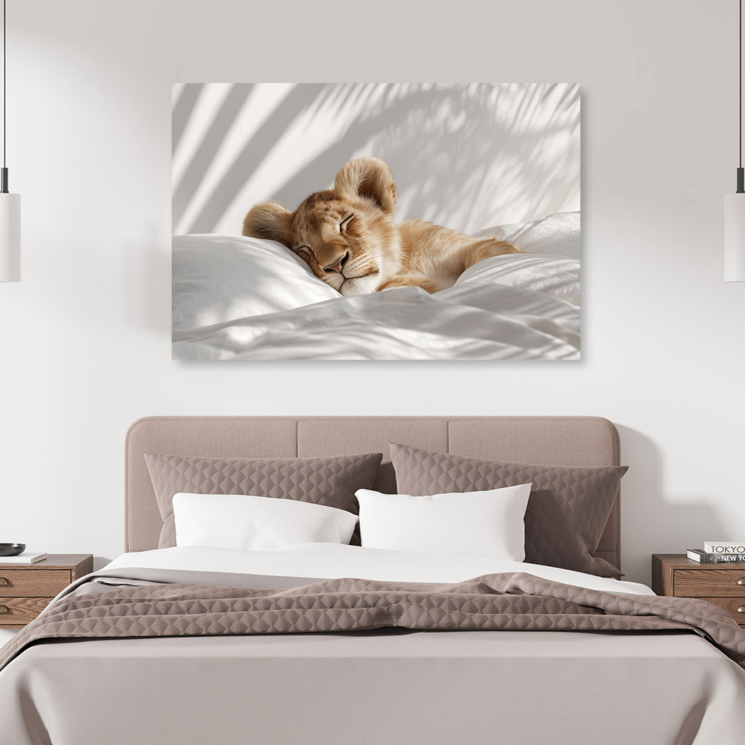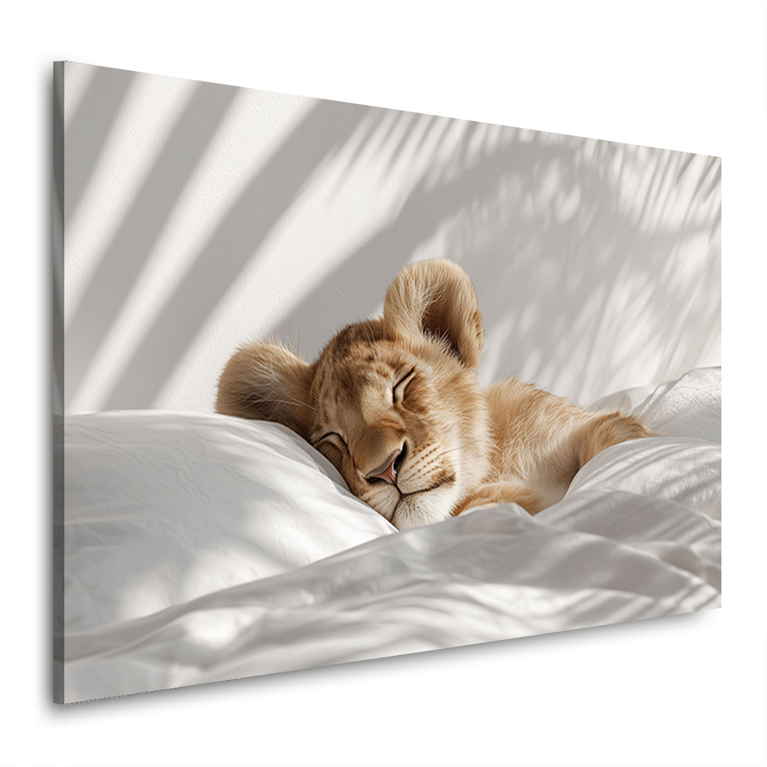Ein schlafendes Löwenbaby in weichen Kissen, warmem Licht und ruhigen Schatten bringt Geborgenheit, Stil und Exotik an Ihre Wand. Dieses Motiv verbindet zarte Eleganz mit edler Tierästhetik und schafft eine luxuriös entspannte Atmosphäre.