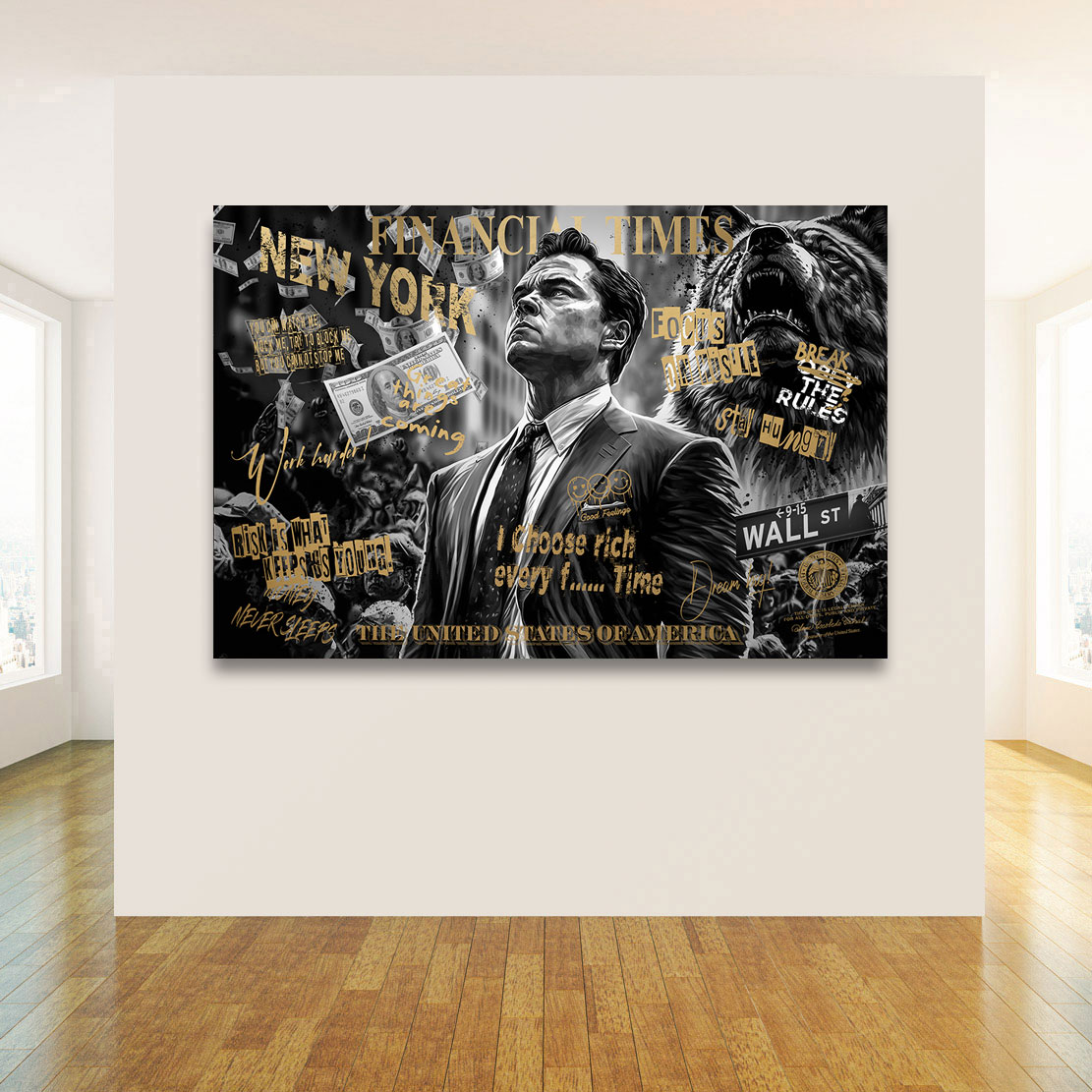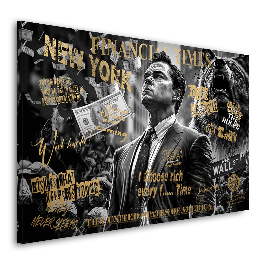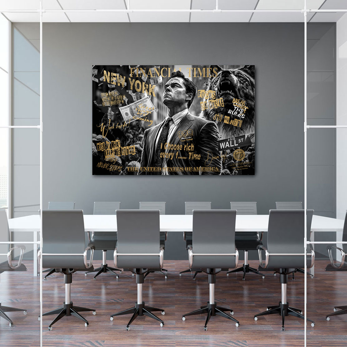 Modernes Motivations Wandbild, Wallstreet Wolf Gold Style