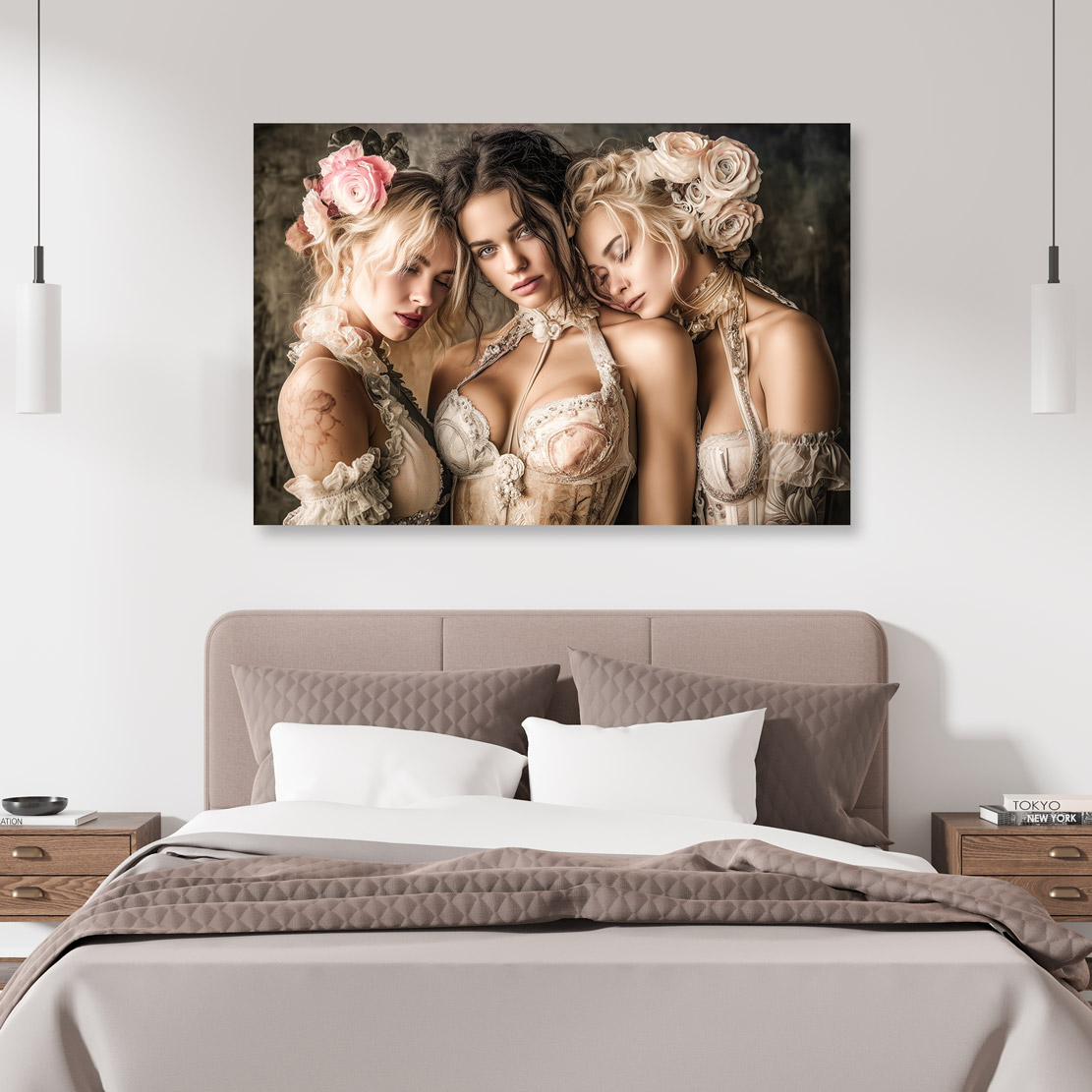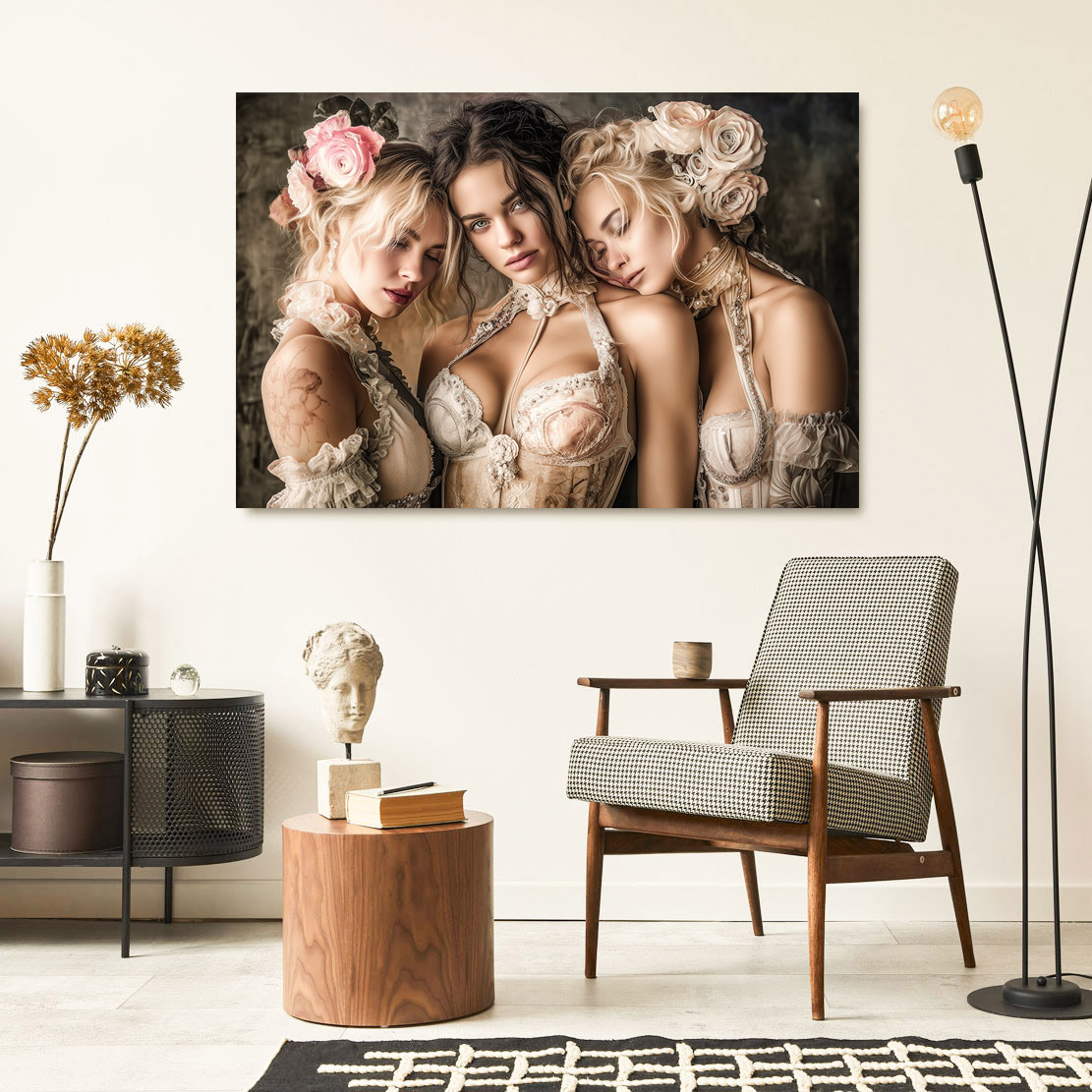 Drei Frauen in nostalgischer Spitze – sinnlich, anmutig und verträumt. Ein Blickfang für Schlafzimmer, Ankleidezimmer, Galerien, Kosmetikinstitute oder stilvolle Lounges.